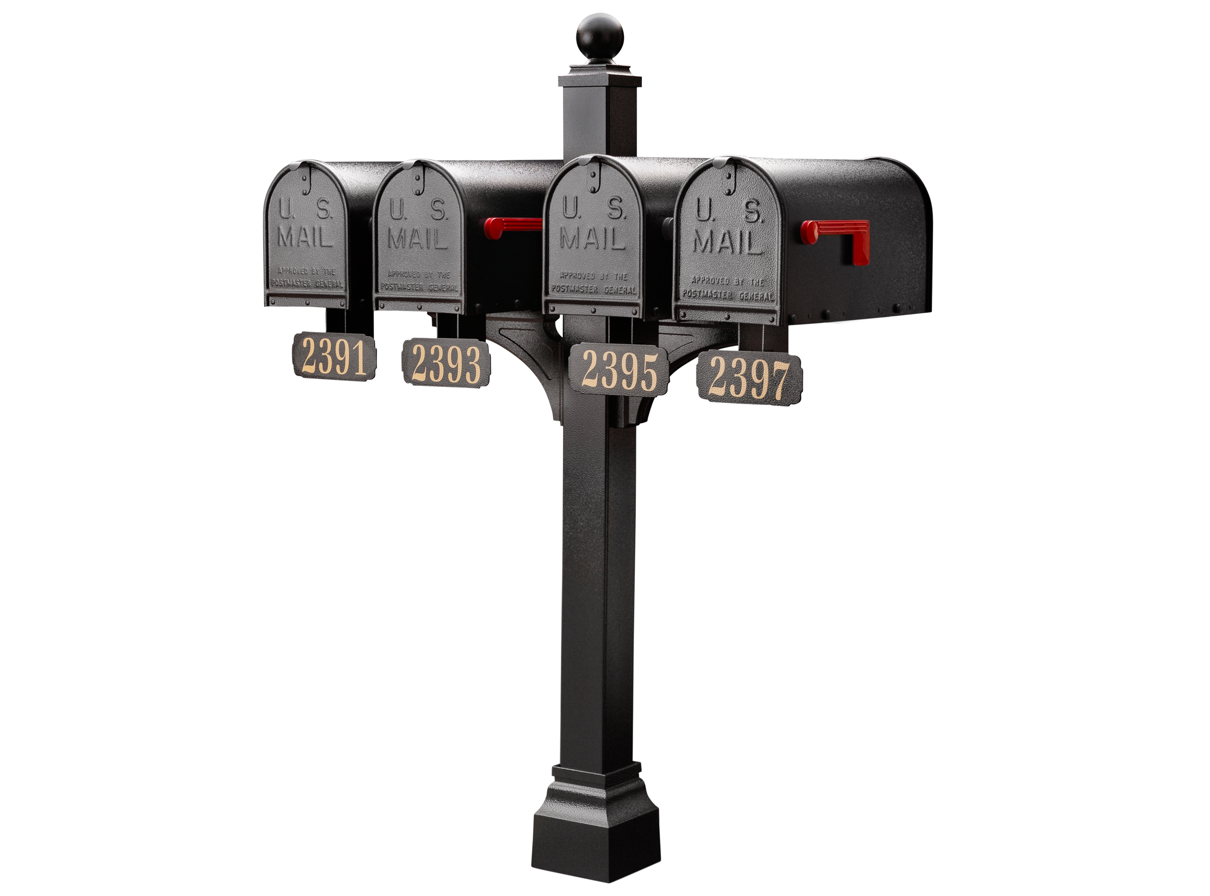 The included heavy-duty posts, constructed from weather-resistant aluminum and available in black, white, and bronze, ensure a secure and stylish foundation for your chosen mailbox configuration. Don't forget to add personalized address plaques (sold separately) to each mailbox for easy mail delivery! The Janzer double and multi mount collection is the perfect solution for builders and HOAs seeking a convenient and stylish mailbox setup.