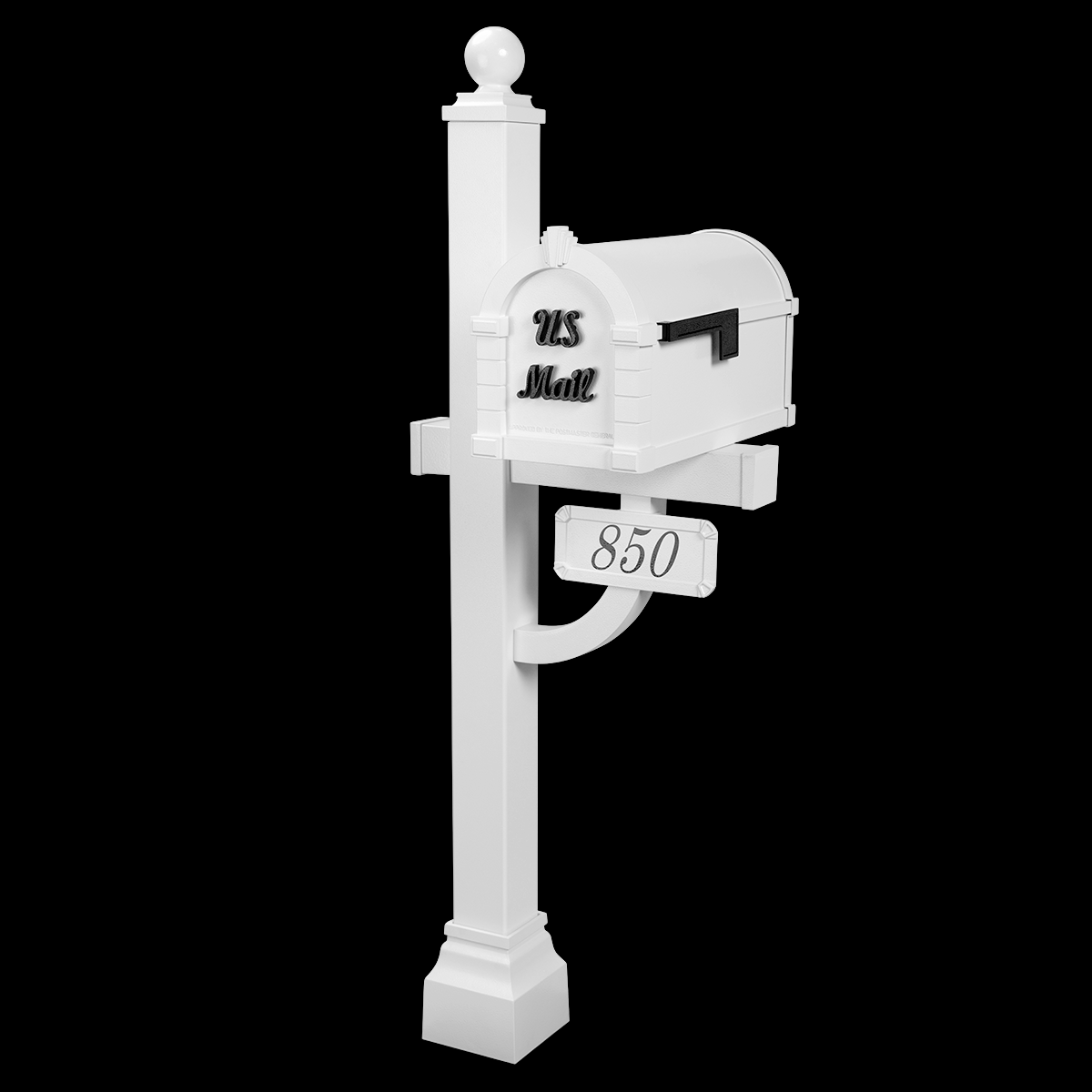 This image highlights the Limited Edition Keystone Mailbox paired with the Standard Post, offering an understated and stately aesthetic. The stark white finish and bold black emblem create a sophisticated statement for your home's exterior..