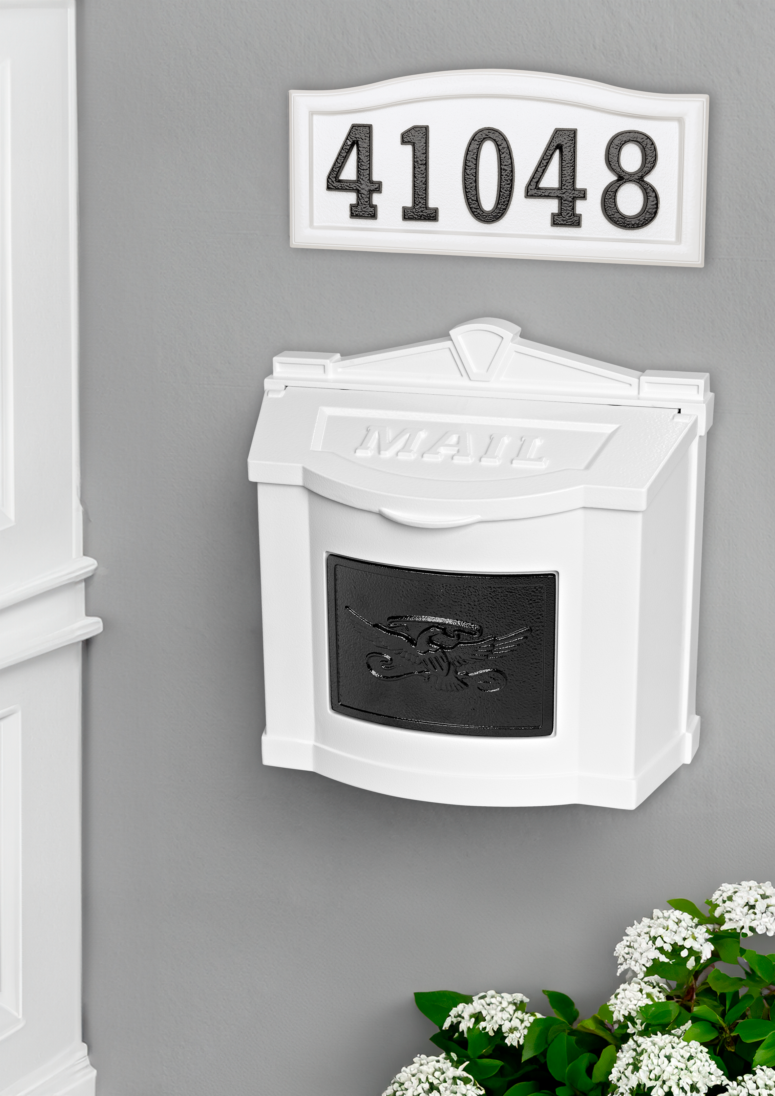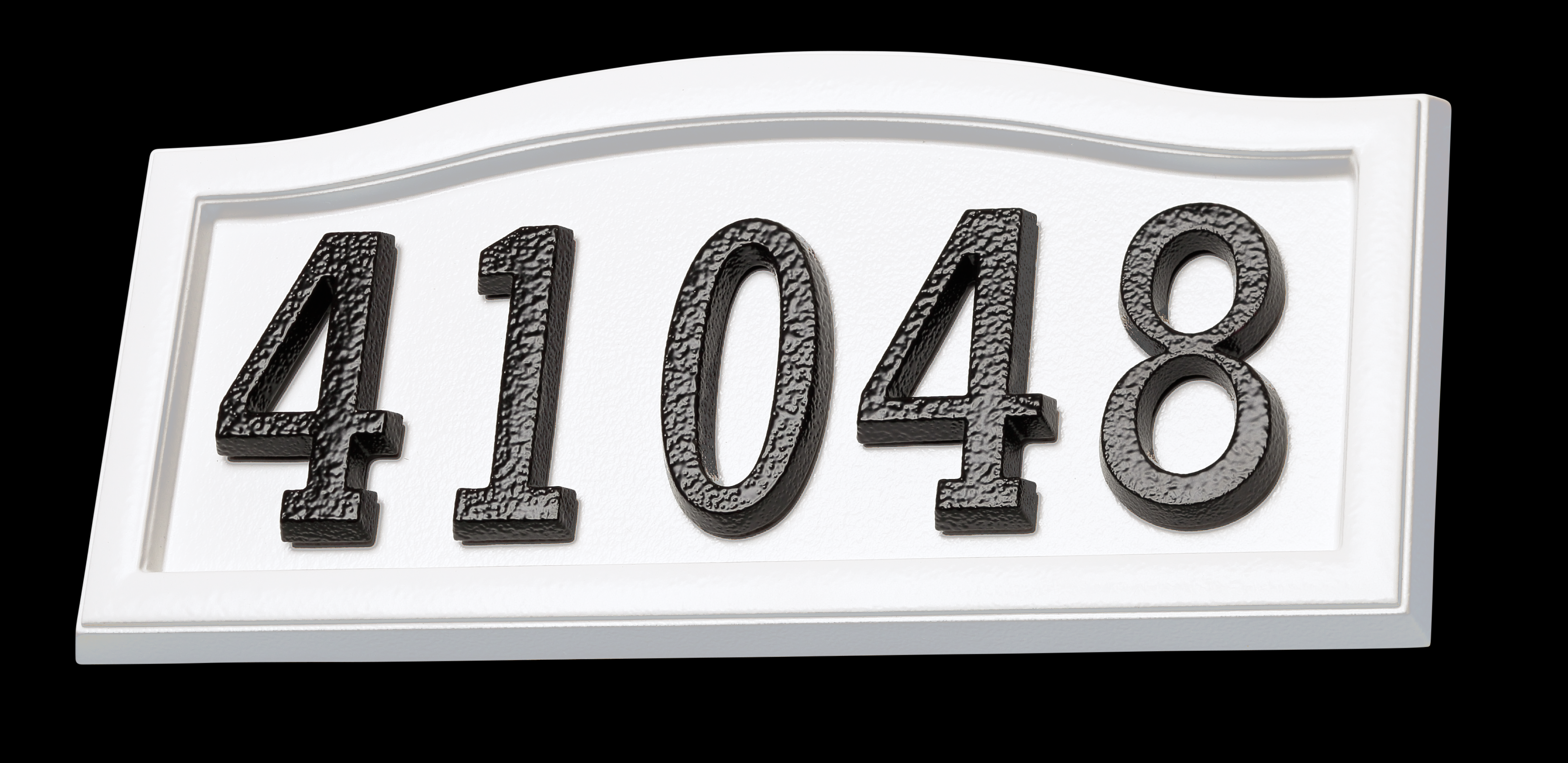 Match your Limited Edition Black & White Mailbox! This exclusive SoftCurve Address Plaque features a textured white finish with bold, textured black numbers for a modern and cohesive look. Numbers "float" for clear visibility, adding a touch of elegance to your home's exterior.