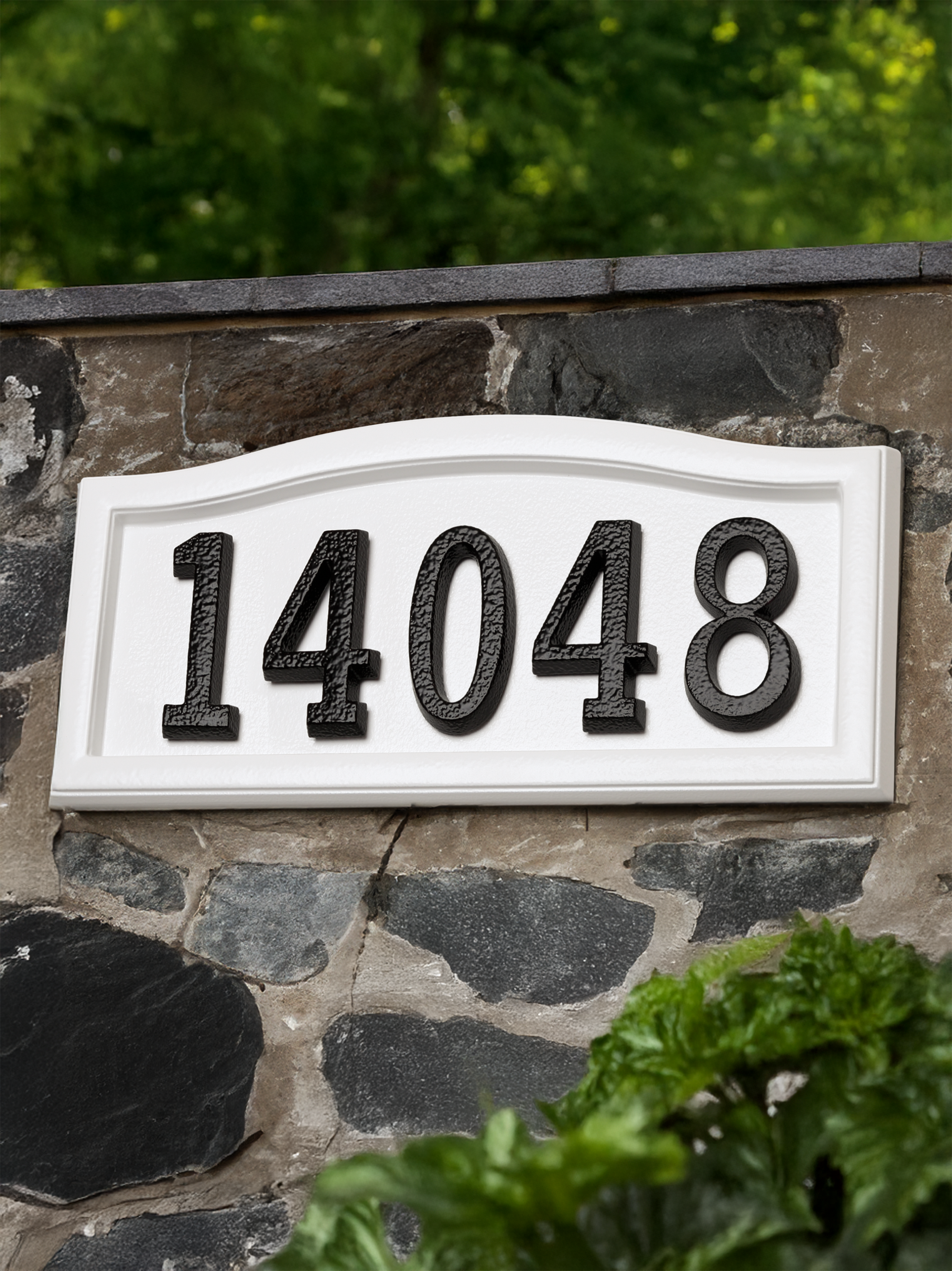 Elevate your curb appeal with theLimited Edition Black & White SoftCurve Address Plaque. This exclusive design features a textured white finish that pops against bold black numbers (sold separately) for a clean and sophisticated look. The textured finish adds a unique tactile element, while the "floating" number design ensures easy visibility for mail carriers and guests alike. This plaque is the perfect way to personalize your home's exterior and create a lasting impression.
