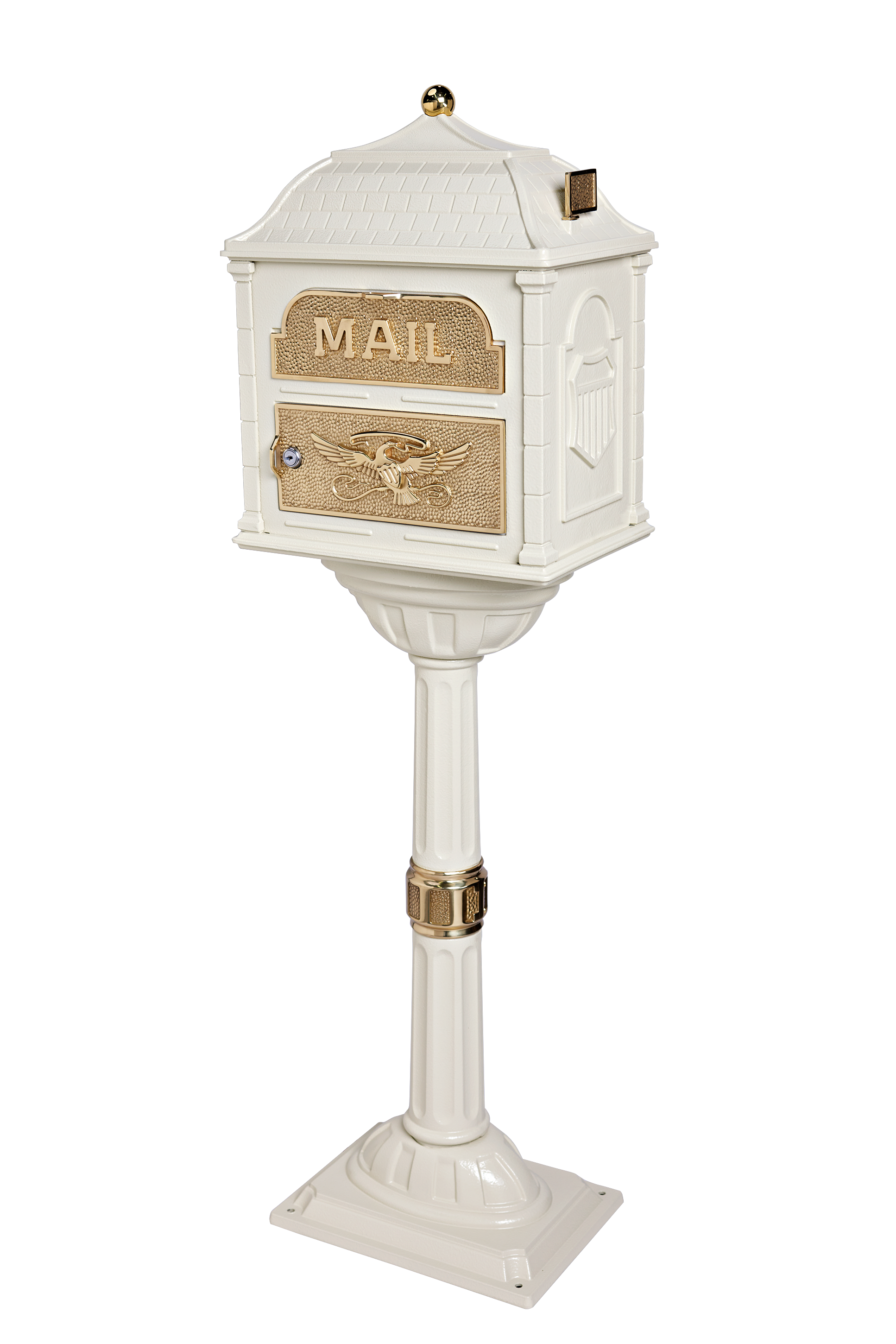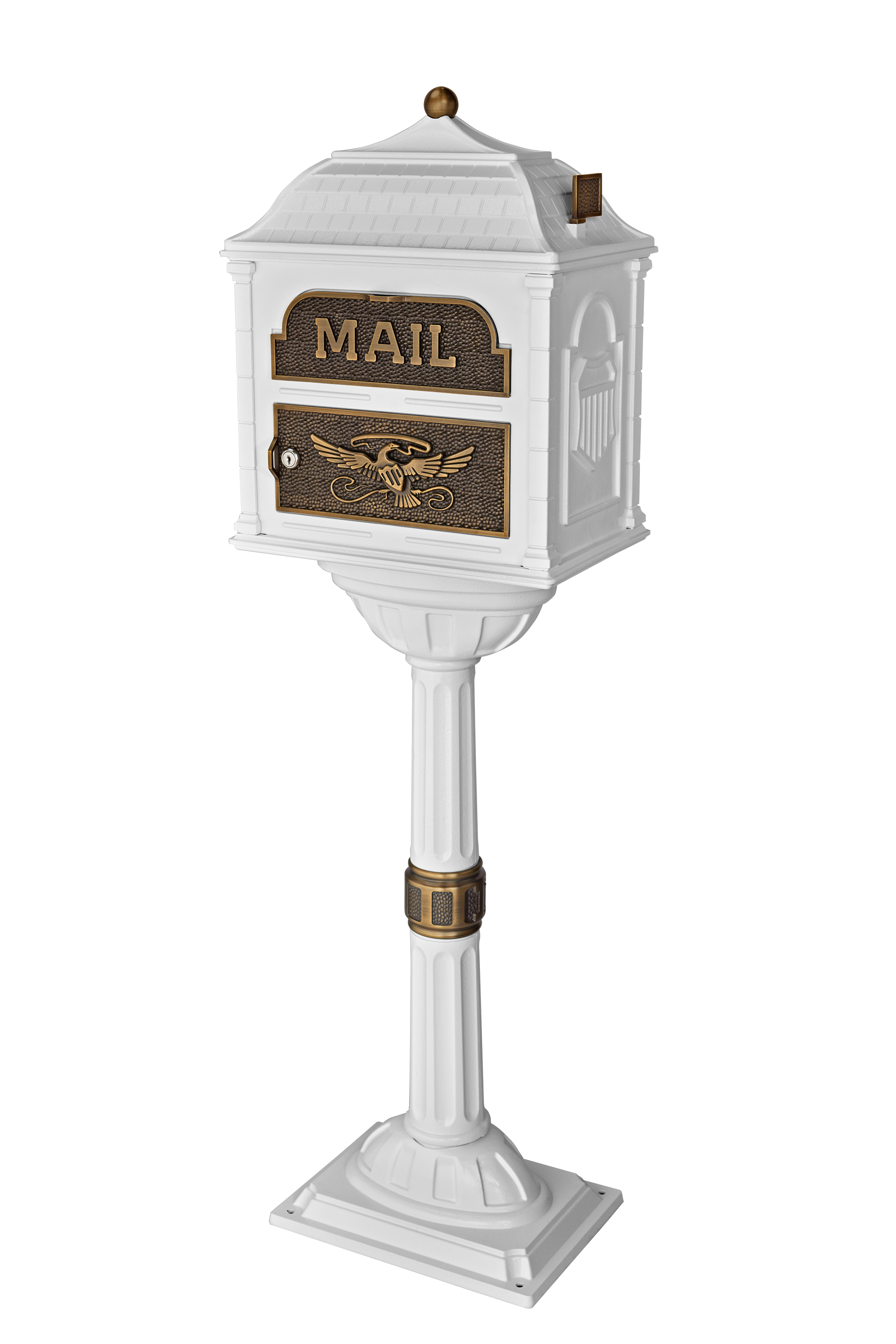 The White with Antique Bronze Gaines Classic Pedestal Mailbox redefines timeless elegance. The crisp white finish evokes a sense of purity and tradition, while the warm tones of the antique bronze accents add a touch of vintage charm. Together, they create a mailbox that seamlessly blends with both classic and transitional architectural styles. The antique bronze finish also develops a rich patina over time, adding a touch of personal history to your home's exterior.